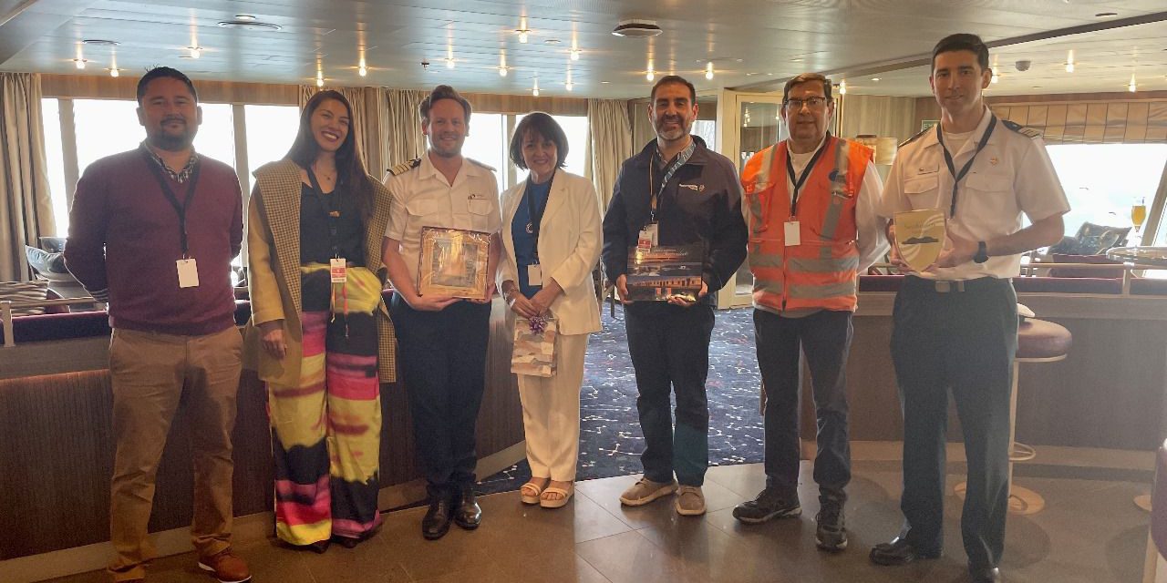 Junto a ello, se ofreció un recibimiento que incluyó un saludo protocolar al Capitán Simón Bishop, junto con el intercambio de galvanos recordatorios realizados por artistas locales. Además, en la línea del trabajo que Puerto Antofagasta está realizando para generar valor local a instancias de arribo de cruceros y turismo de intereses especiales, se realizó una muestra de artesanía y bailes de la zona, junto con información sobre operadores turísticos y guías de la región.
