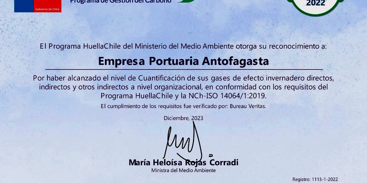 Debido a una sobresaliente gestión ambiental, por cuarto año consecutivo el programa Huella Chile 2022 del Ministerio de Medio Ambiente otorgó el reconocimiento “Cuantificación” a la Empresa Portuaria Antofagasta (EPA), certificación que indica que la empresa ha logrado cumplir nuevamente con éxito los requisitos necesarios de medición de gases de efecto invernadero.