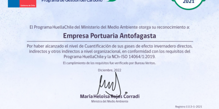 Un importante hito alcanzó Puerto Antofagasta en materia de medio ambiente, tras alcanzar por tercer año consecutivo la Certificación de HuellaChile 2021 por haber alcanzado el nivel de “cuantificación” de gases de efecto invernadero directos e indirectos a nivel organizacional, en conformidad con los requisitos del Programa HuellaChile y la NCh-ISO 14064/1:2019.